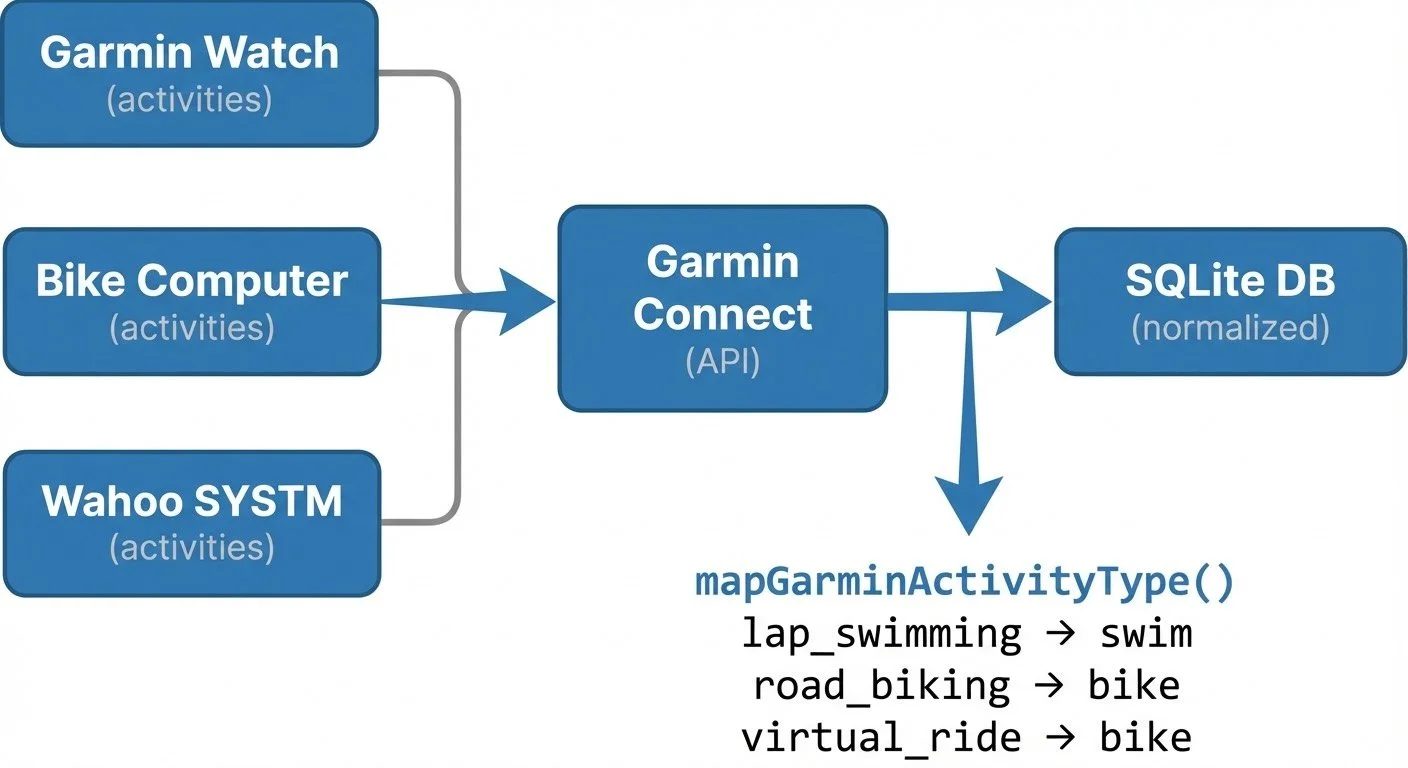 Garmin's activity types are granular—lap_swimming, road_biking, virtual_ride. This required a mapping function to normalize them (garmin.js:18-48):