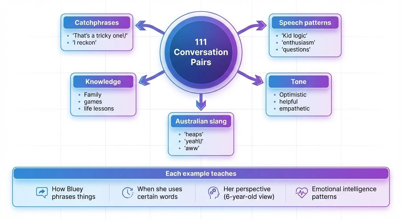 Building a personality dataset is character study. Every example teaches the model not just what Bluey knows, but how she thinks. "Yeah! I can help!" vs "Yes, I can help" is a small word choice difference that carries personality weight.